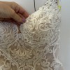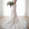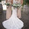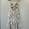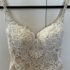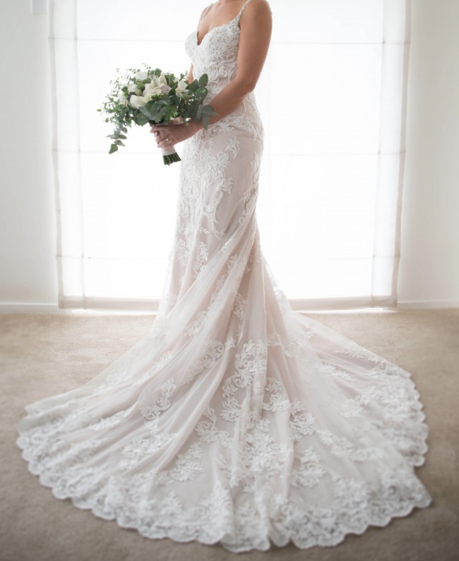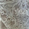 Beautiful champagne and ivory beaded and lace dress with long train. Button down back (with hidden zip). Long lace edged train with button to pin up for dancing. Inserted cups for extra padding that can also be removed.