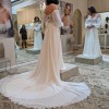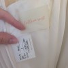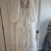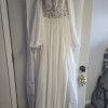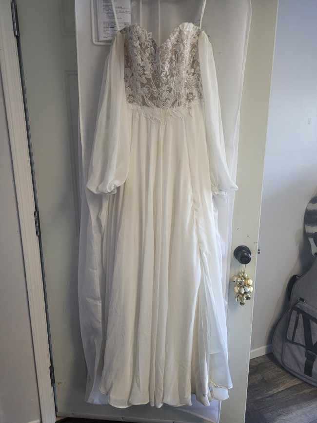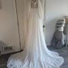 Not rack pretty but stunning on the body. Incredibly delicate and soft fabric, it was a dream to wear (both ceremony and reception). 1 button missing on sleeve cuff. Minor dirt stains on train. Minor powder smudges. Hate to part with it but need money for medical bills, thus not dry cleaned.