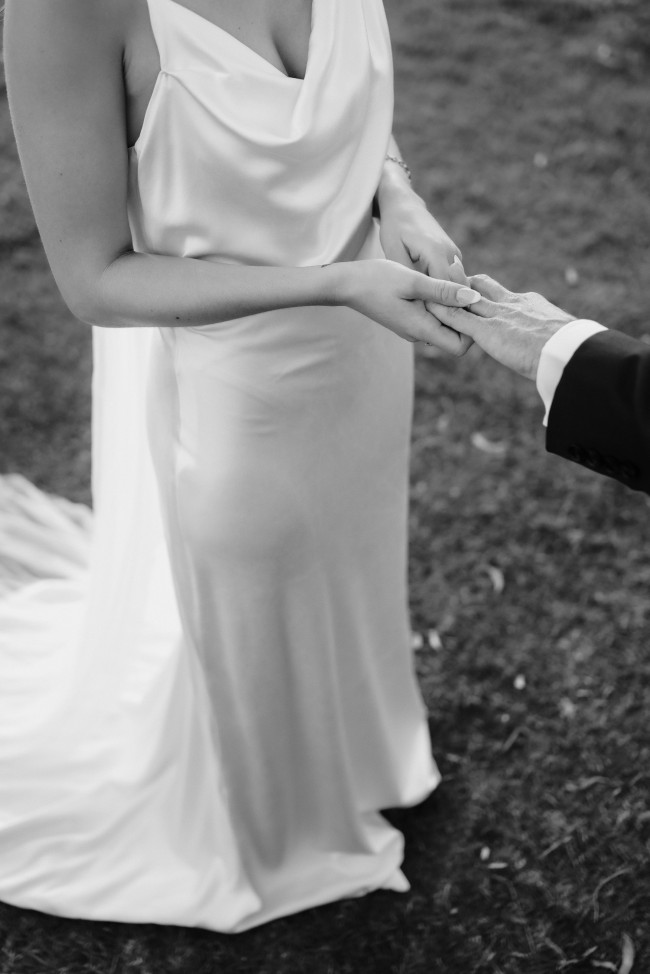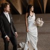 This simple asymmetrical ivory gown is trimmed with extravagant satin-covered buttons down the back for a little extra retro glam.