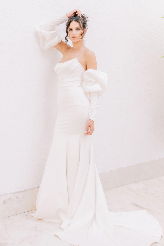 Sophisticated and alluring, the Elynor gown is timeless. Perfectly draped and pleated and finished with an elegant satin tie and removable puff sleeves, this is guaranteed to steal the show.