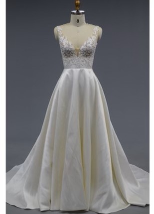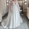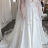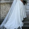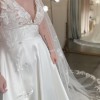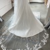 This stunning brand new dress, featuring a V-neck and cathedral train, is a unique find—perfect for making a statement on your special day. It boasts a padded bra and convenient pockets, plus the train can be bustled and has a wrist strap for easy handling. Additionally, a matching veil is included to complete the beautiful ensemble.