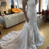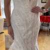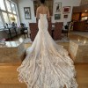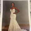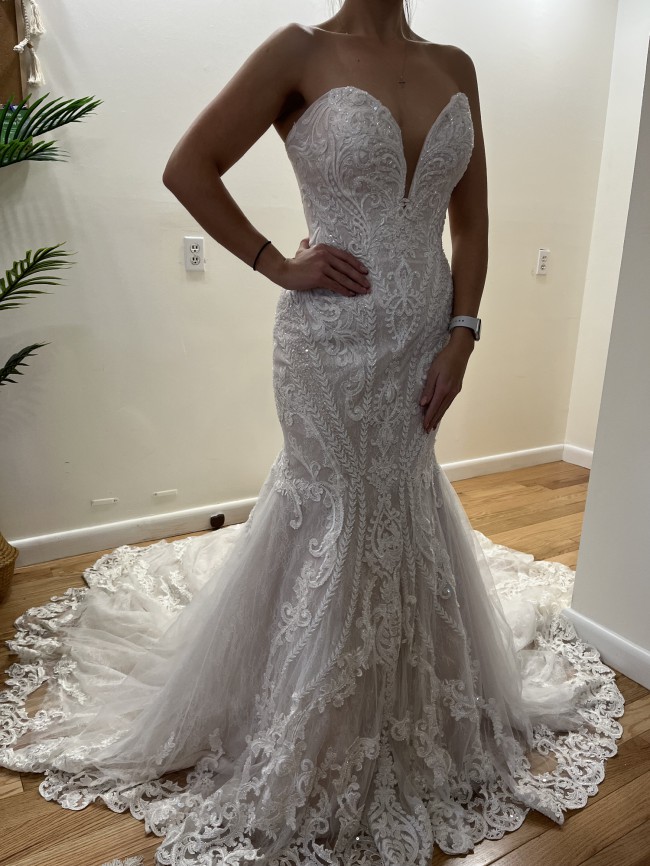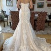Martina Liana 1187 is a romantic fit and flare gown featuring graphic lace + rich beadwork! The plunging strapless sweetheart neckline is accentuated by the simple open back with covered buttons. The skirt is layered with glitter tulle for an extra sparkle! This gown comes to us in excellent condition from a designer boutique