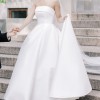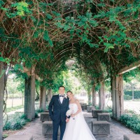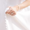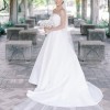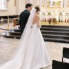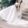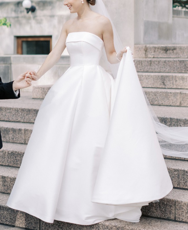 This dress is a clean and classic satin ballgown, perfect for a timeless bride! I knew I wanted something simple and elegant, and this dress checked all the boxes. It has a rich satin fabric, clean neckline, gorgeous princess pleats in the front, and a low back with buttons down the train. It comes with a detachable belt and detachable straps. Also, it has roomy pockets which was actually a huge plus because I could keep tissues, lipstick, and even my phone on me throughout the whole day.