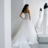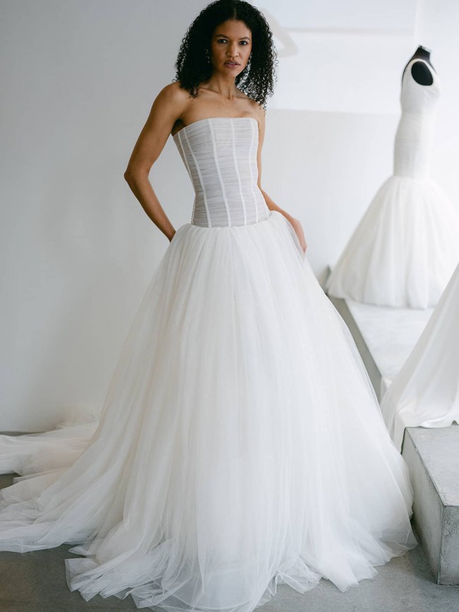 Ballet-core energy en pointe via Beau. Its structured, dropped waist bodice is artfully draped with soft tulle, but it’s the full, gathered skirt that delivers the kind of drama that is usually reserved for the stage.