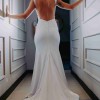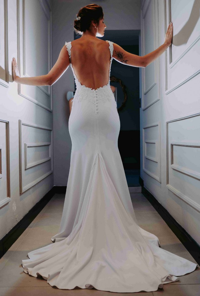 This one-of-a-kind pure white wedding dress was custom made of stretch crepe fabric and guipure lace applique. The stretch fabric will allow for a non-constricting fit. The straps are completely made of the lace and travel down to the waist which is extremely flattering.