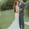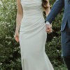 Crepe Wedding Dress. Draped Crepe bodice with scoop neckline and detachable draped Crepe sleeves. Draped fit and flare skirt with fabric covered buttons from center back to hem.