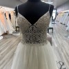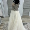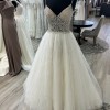 This dreamy princess gown has a full ball gown skirt . The color is champagne with ivory, nude The skirt has layers of sparkle tulle and an attached cathedral train. The gown has sparkle everywhere ! The illusion see through bodice has an overlay of hand beaded crystals, sequins and pearls . The bodice has a vneckline and attached beaded spaghetti straps. The bodice and the sparkle tulle skirt shimmer in the light. This gown is in excellent condition. It has no tears or stains. It has been a sample in my bridal salon. It has never been altered or worn for a wedding. This gown fits many venues , but it’s a great gown for a garden wedding .