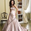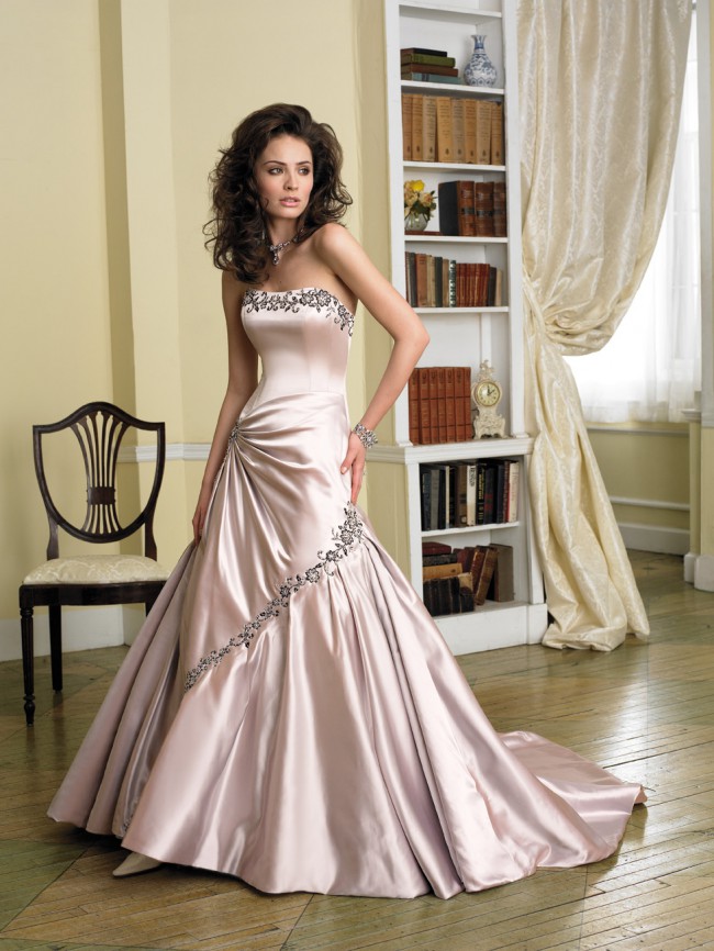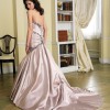 Satin strapless gown with embroidery along neckline and draped asymmetrically over a-line skirt. Lace up back with chapel length train. Removable spaghetti straps and halter straps included.