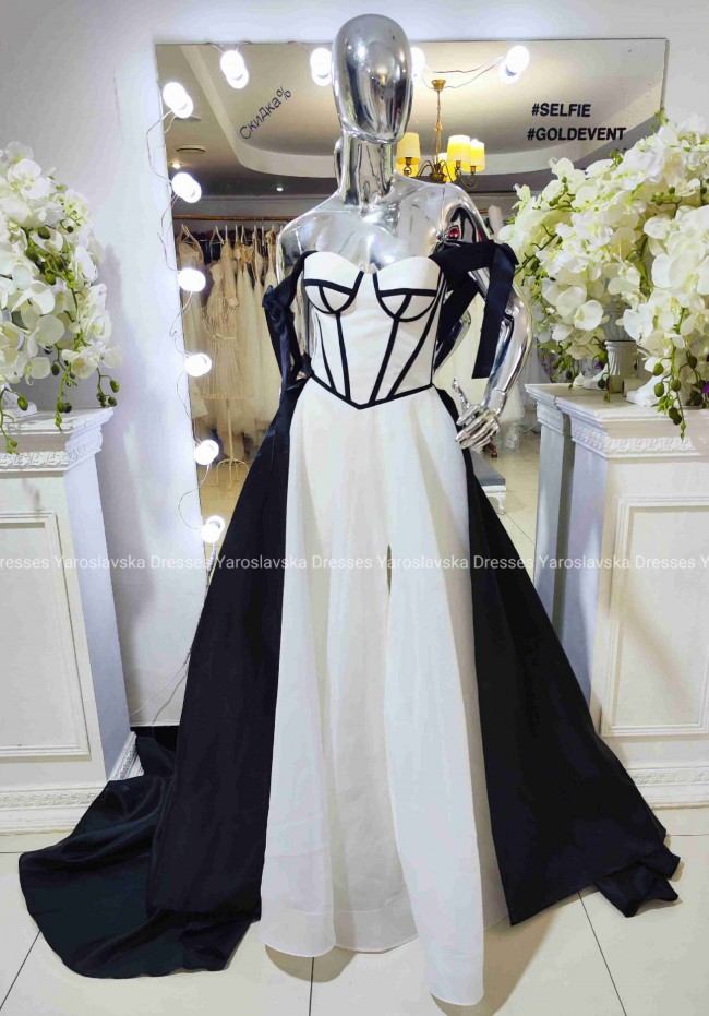 Custom Black and White Organza Corset Wedding Dress with Dramatic Detachable Train - Designed by Yaroslavska Dresses collection 2025
