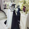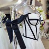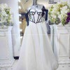 This elegant black and white wedding gown is made of silk matte black and white organza fabric, featuring a striking corset bodice with bold black piping for a flattering silhouette. Skirt has high slit.The design is completed with a dramatic, detachable train that flows effortlessly for a truly show-stopping entrance. Perfect for brides seeking a blend of modern style and timeless elegance.