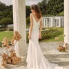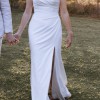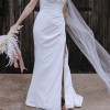 Luxurious crepe molds to her bride’s body, smoothing over the hips for the perfect fit with a split to add drama.