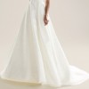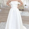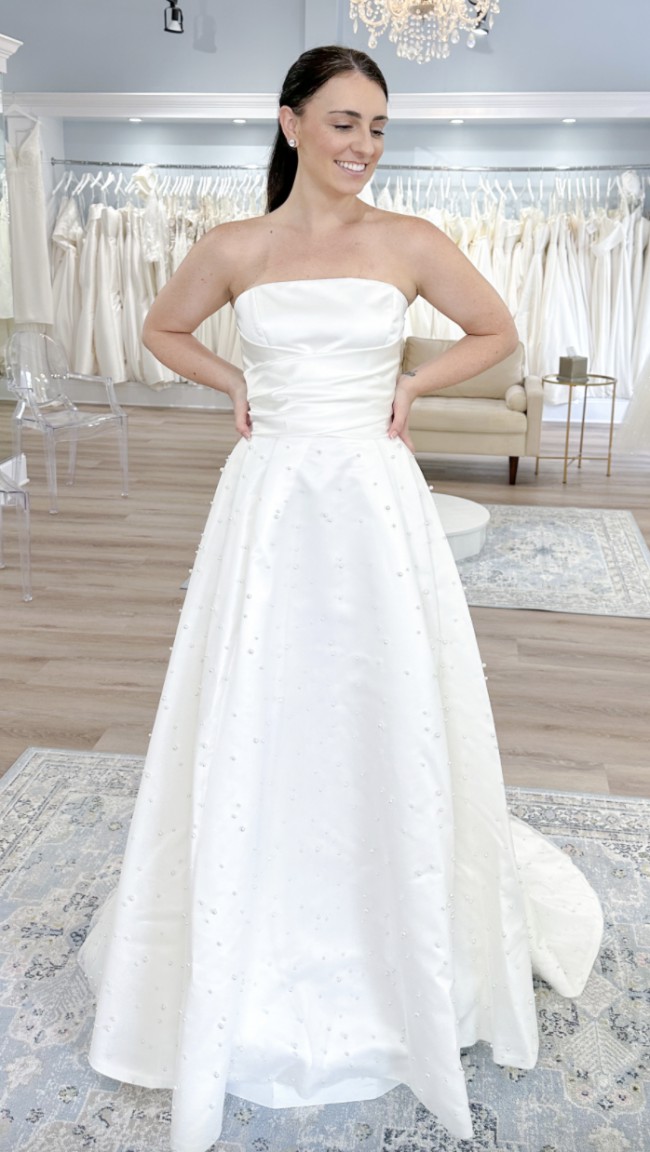 Dress with straight strapless neckline and draping. Skirt covered in pearl tulle.