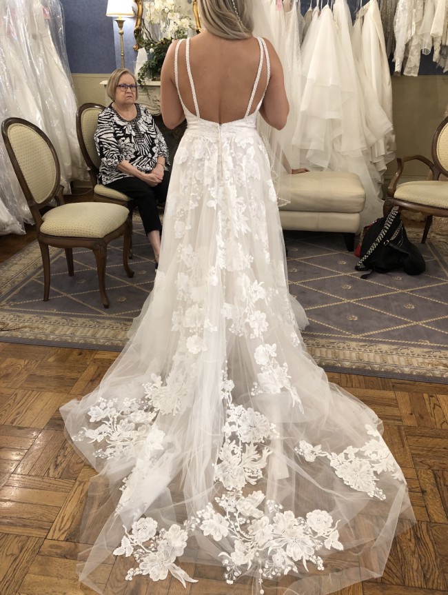 My dress I never got to wear! I’m trying to buy a new one because I’m unfortunately not a size 6 anymore. So I’m hoping to sell it before April and use the money to buy my new wedding dress. My wedding was canceled due to Covid and this beauty has been in my closet ever since. I’d love nothing more then for someone to be able to have it for their special day rather then it not seeing the light of day in my closet forever lol! It’s from Low’s Bridal in Brinkley Arkansas. It’s lace with a long train. Fits tight around the waist with thin straps in the back.