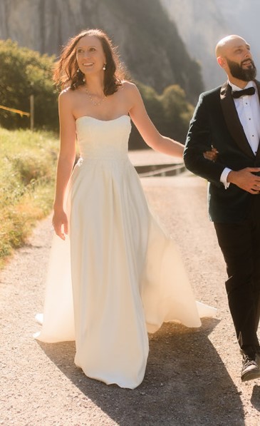We eloped in Switzerland, and this dress held up; let me tell you. It's so light, despite the satin and train. It's considered a ballgown but I think it was the perfect amount of flair and shape without being over the top in size. The beading/embroidery is what sold me on it. It's so detailed yet not over the top; it's just a classy dress all around. It steamed out perfectly with only a travel steamer I brought. Has pockets! and a built in bra strap so you can choose to not wear your own. I did just to add some cup size. It has some dirt stains at the bottom in the back as I didn't dry clean it and we did a lot of walking/hiking outside.