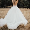 The V-neckline and low back create an alluring yet sophisticated look, while the spaghetti straps provide just the right amount of support. The floor-length design ensures that you'll feel like royalty as you glide down the aisle. The overskirt adds a dramatic flair, ideal for twirling during the first dance.