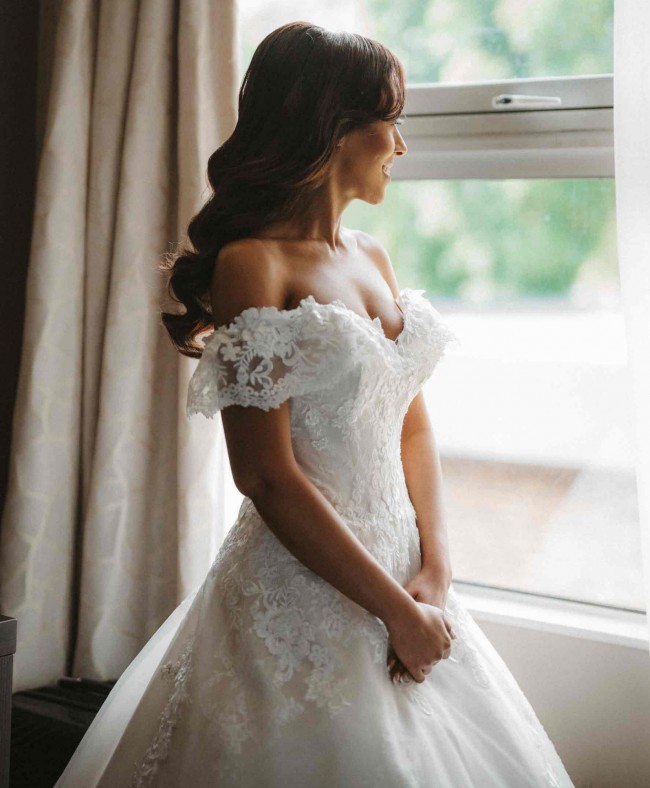 This elegant wedding dress is a timeless blend of classic and modern design, perfect for a bride seeking sophistication and romance. The gown features a flattering A-line silhouette with a fitted bodice and a flowing skirt that moves gracefully. Delicate lace detailing adorns the bodice and sleeves, adding a touch of intricate beauty. The dress has a subtle sweetheart neckline and a stunning open back for a contemporary twist. Made with lightweight, high-quality fabric, it is comfortable to wear throughout your special day. In pristine condition, professionally cleaned and ready for its next bride!