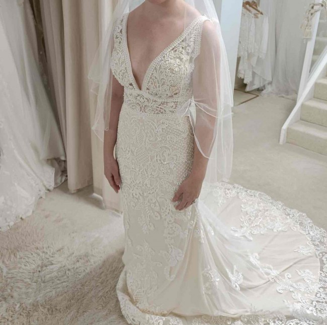 Art Couture wedding dress. Size 8 tag but would fit a size 10 as it was too big on me. Never been worn and no alterations. Champagne coloured underskirt. Zip opening with buttons for decor. Lace and embroidery detail. Perfect condition. Sleeveless - I have a veil on. Bought from a bridal shop and changed my mind