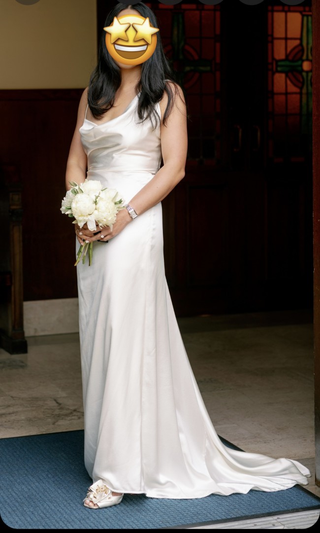 I tried on more than 40 dresses and this was my dream dress! It’s a perfect balance of classic and cool girl, and the fabric is incredibly luxurious. I wore it briefly during my church ceremony in July 2024 before changing into a different dress for our reception. It has not been altered in any way.