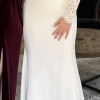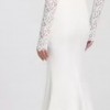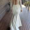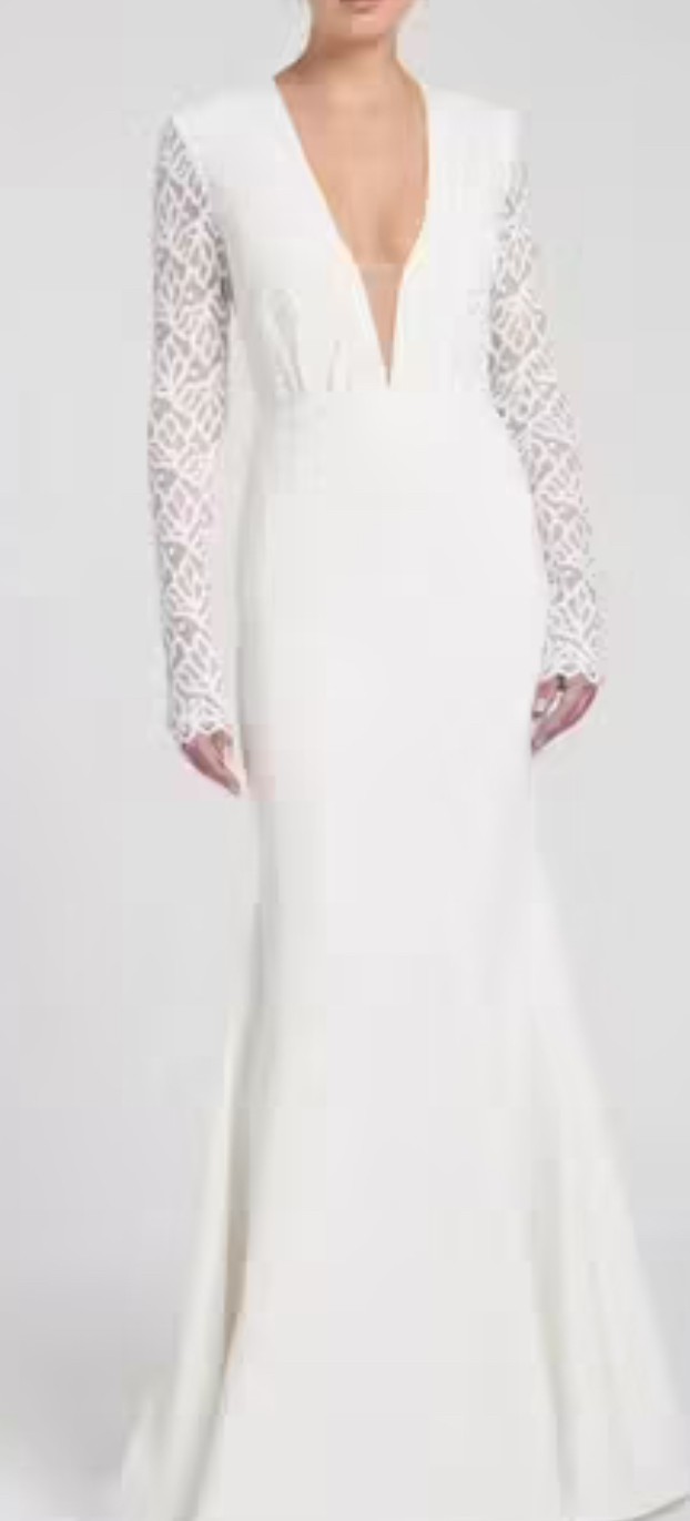 The romantic Harper Gown is designed from a thick structured crepe for a close, slim fit to the body and elegantly flare out to a mermaid hem with dramatic train. The lace overlay on bodice and sheer contrasting lace sleeves add a touch of romantic glamour and the plunging neckline and back cut out create drama and the front mesh insert provides support