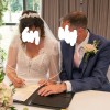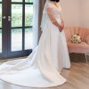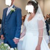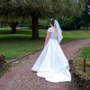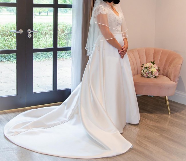 Beautiful dress. Really was the dress of my dreams. Beautiful lace design at the top, capped sleeve, fitted at the waist so looks gorgeous at the hips but the material doesn’t cling to your stomach so it’s the best of both worlds! The contrast between the intricate lace design on top and the plain white bottom with the button detail on the back is stunning. So many people, including staff at the venue, commented about never seeing a more beautiful dress. I’m 5 foot 4 and it was adjusted to my height but it would easily work for people 3 inches shorter or taller based on the shoes you could wear (I wore very small kitten heels). Bridal size 12 (normal size 10). Has been professionally dry cleaned and packaged and has come out looking absolutely perfect and like new. RRP £1500.