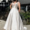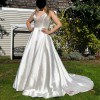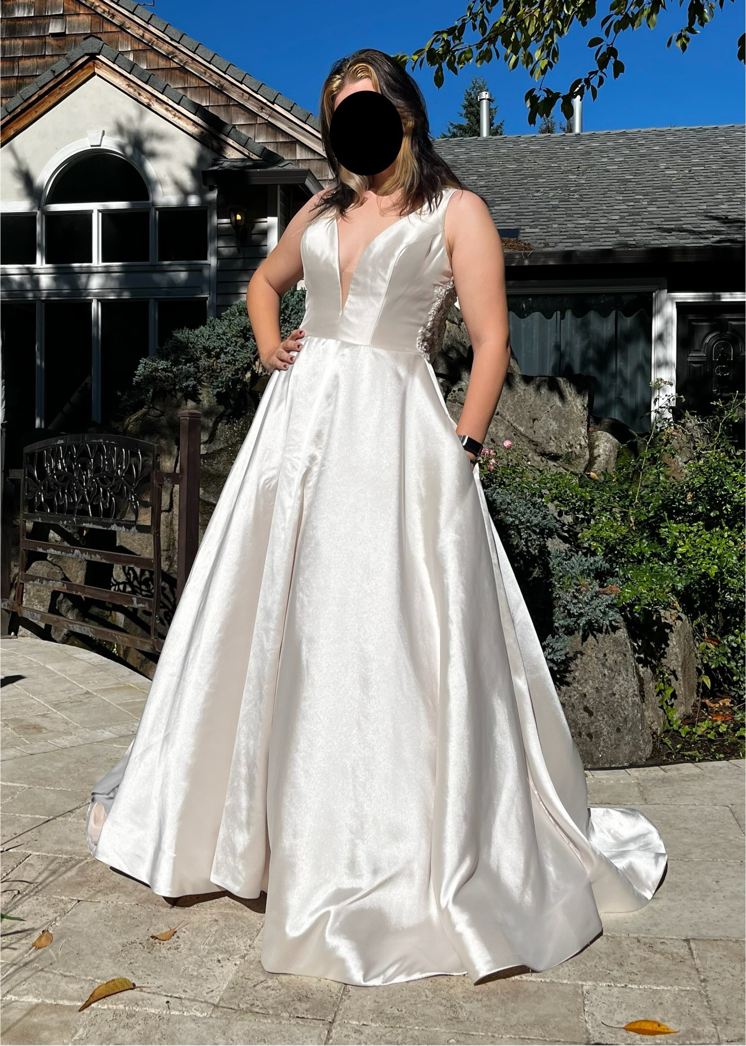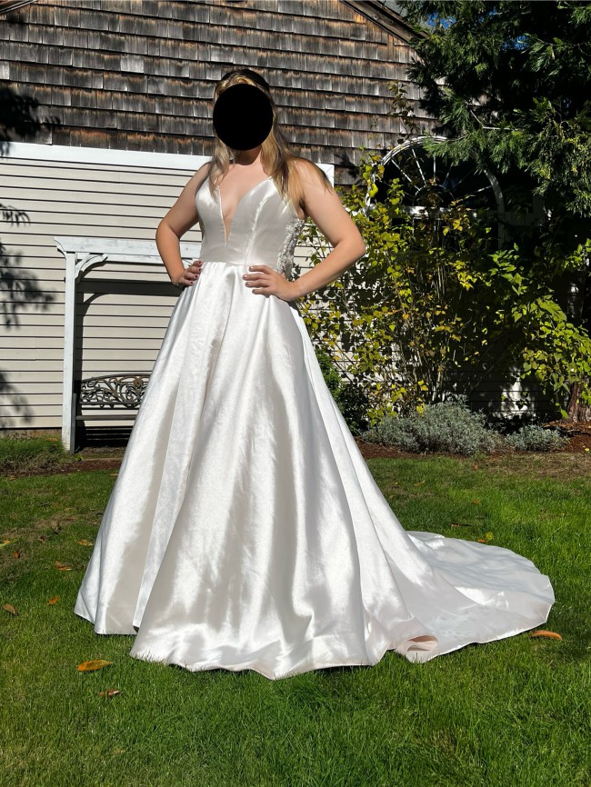 This dress bought secondhand from Blue Sky Bridals in Portland, OR. It has a stain on the bottom of the skirt that the consultant said could washed off through dry cleaning. The fabric is specifically silk mikado, which is a luxurious silk that's heavy for structure and it's color is specifically the "Diamond White/Ivory I found this dress to be perfect for both warm and cold weather due to the cut and the fabric.