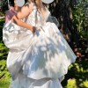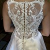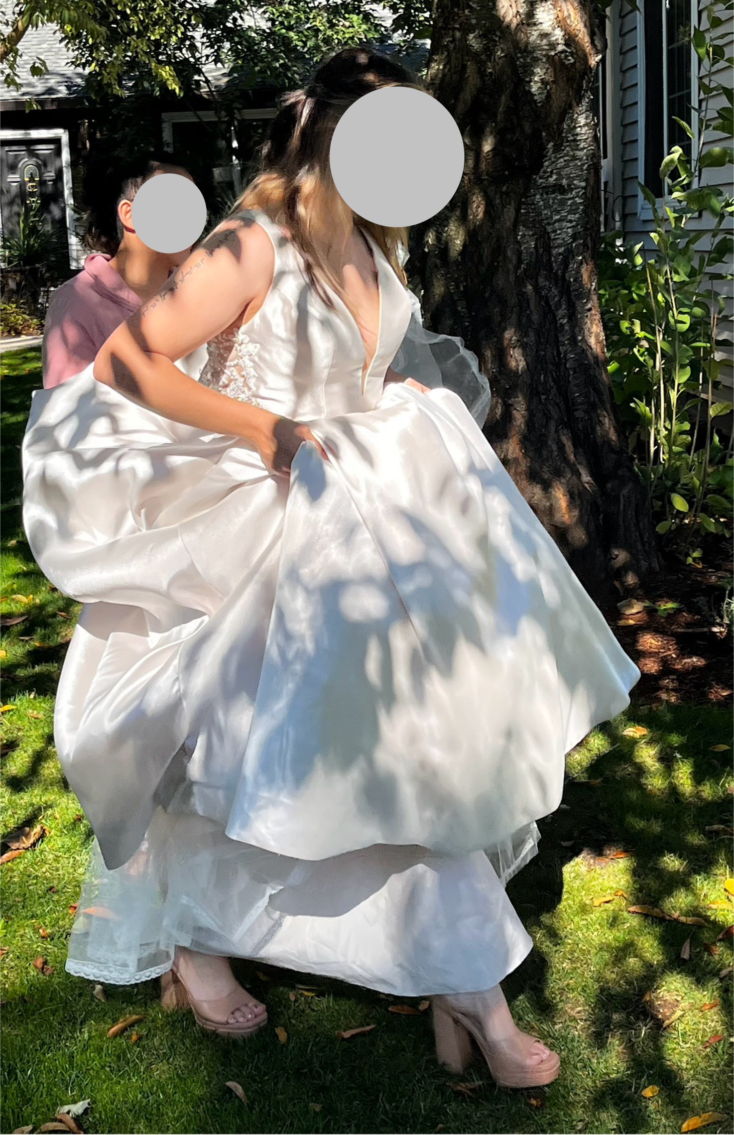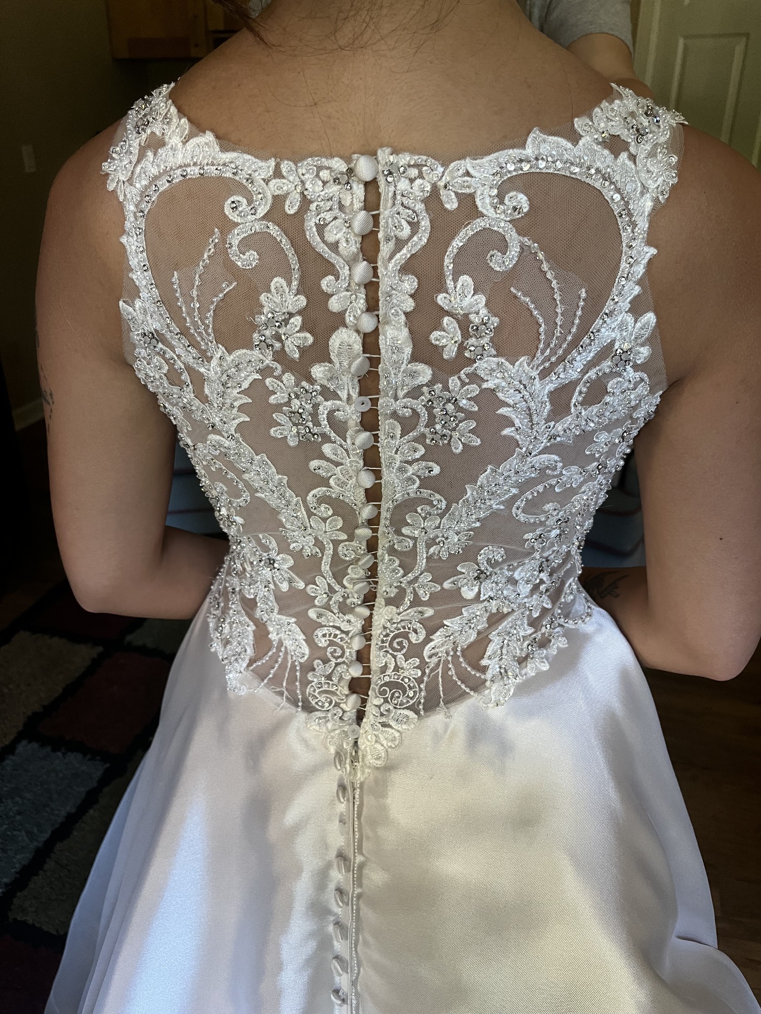 I truly felt regal when I wore this, my favorite part being the chapel long train. I ended up going with a different dress to fit my venue, so this has been unaltered and has no bustle..