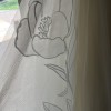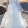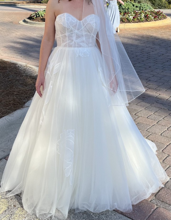 This dress was perfect for a beach wedding. It moved elegantly on the beach and did not pick up any sand as we were taking pictures or while I was walking down the aisle. The floral appliques on the skirt are beautiful and showed beautifully during the ceremony and reception. The dress is already bustled and has sewn in bra cups. There is a slight tear near one of the bustle holes, but the dry cleaner/wedding dress specialist said it can easily be fixed. The only alteration besides the bra cups and bustle was a slight take in on the bust. The dress has about 7 layers. The bustle is composed of loops and buttons in two tiers.