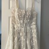 I loved this dress because of the pearl detailing on the corset bodice and the sheerness of the bodice. I realized I wanted a strapless dress, but I didn’t want to alter this beautifully made dress that could be perfect on someone else! The train of this dress is absolutely to die for along with the leg slit! I love that the lining of this dress is nude colored instead of your typical white or ivory, which makes this dress unique. Very flowy and perfect for a garden or tropical wedding!