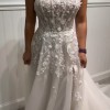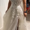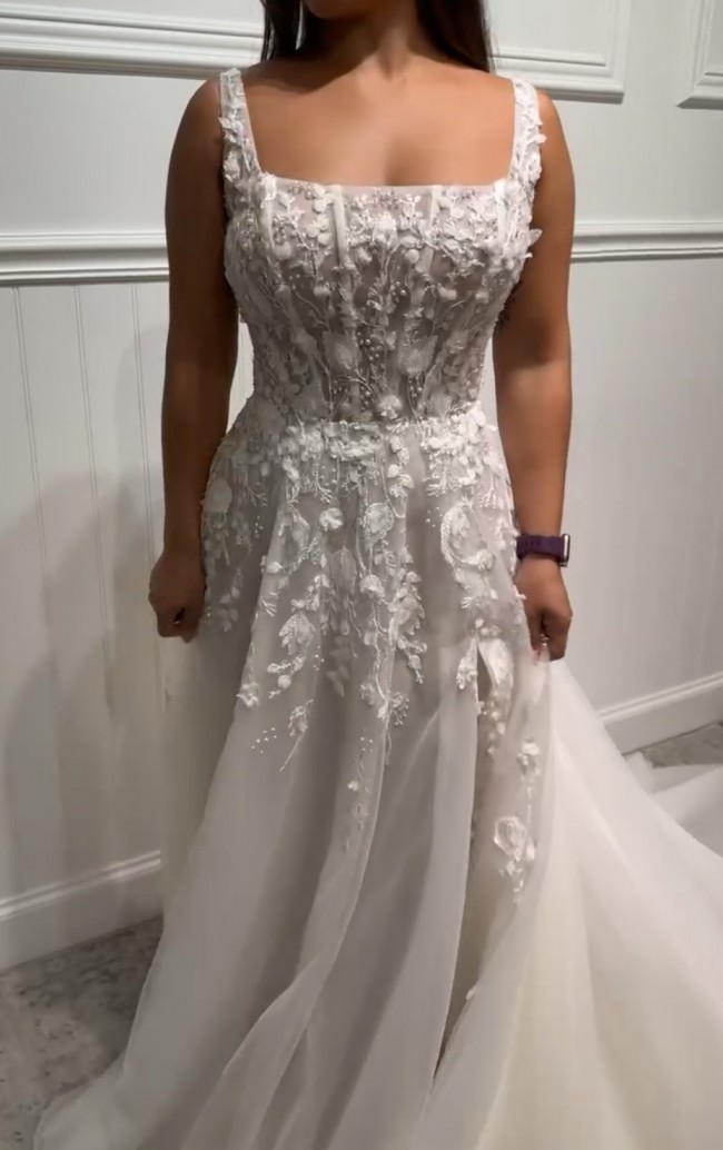 Get swept away in the fairytale romance of Style D4030, a romantic A-line wedding dress of elegant lace, tulle, royal organza and 3D floral lace appliqués. From embellished shoulder straps, a classic square neckline introduces a sheer corset bodice with pearl button closures in the back. From the waist, the timeless A-line silhouette softly skims the figure, opening at the thigh for an alluring leg slit as delicate lace appliqués scatter across flowy layers of tulle. With its blend of classic elegance and contemporary edge, this square neck wedding dress promises an entrance as alluring as it is ethereal for the bride who dreams of infusing romantic wonder into their special day.