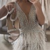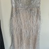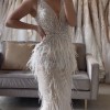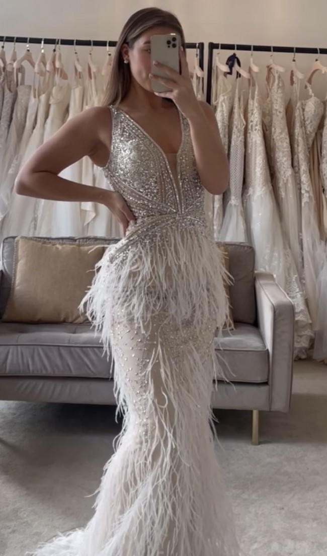 I am absolutely IN LOVE with this dress and it is breaking my heart to sell it but we have had to postpone our December wedding by two years. So I am reluctantly selling it as I don’t want it sat in a dress bag when it deserves to be worn! The details on this dress are stunning, the feathers, the sheer body, how it clings to your curves it honestly makes you feel unreal! I am 5’8 and weigh 12 stone. It has had no alterations and has only been tried on in the store then stored in the dress bag. It has a real vintage art deco feel and charm to it and I’ve seen very few dresses like it on the market.