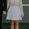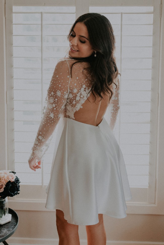 A custom Christie Nicole Bridal dress designed and made in 2019. Long sleeve mini dress - perfect for a second look reception or engagement party look. Double lined silk from the waist down, sheer mesh long sleeve top (backless) with 3D flower/pearl/bead hand sewn over the lace to discreetly cover the chest. Silk buttons behind the neck and at the wrist that are functional to get the dress on and off.