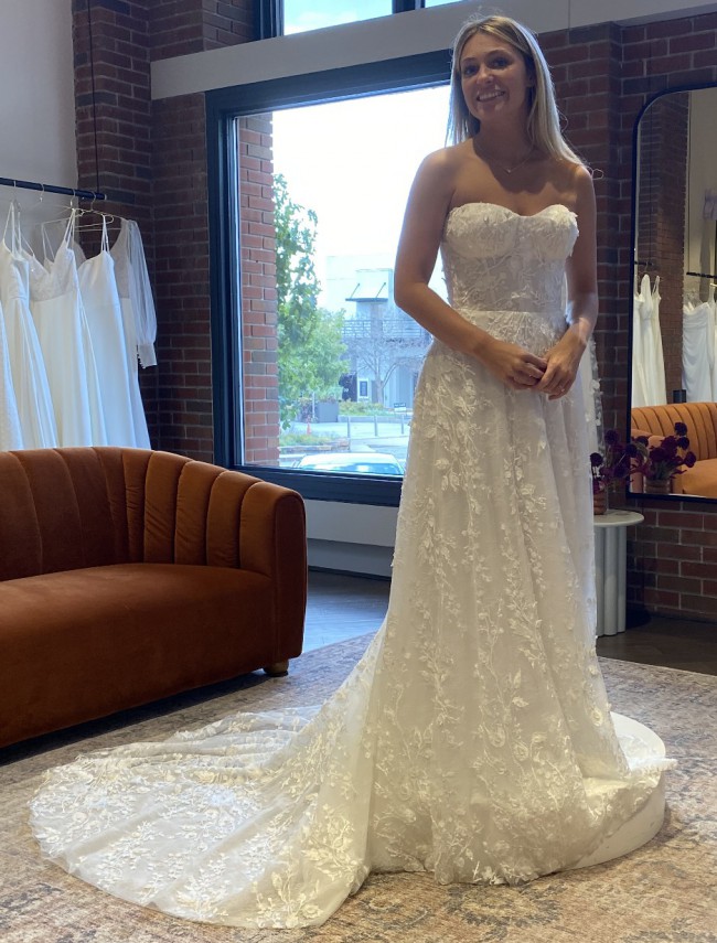Made With Love Penny Flowy dress with beautiful 3D lace in new, never-worn condition. The dress is a label size 14 but has been altered. We purchased the dress at a bridal boutique sample sale last year, but it could not be taken in enough to fit my daughter’s current size. She did not wear it at her wedding. Penny detachable sleeves purchased directly from MWL in Australia are also included.
