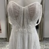 Style 1520 brings that Old World glamour to life in a stunning beaded A-line wedding dress that sparkles and shines! Detachable off-the-shoulder straps can be worn on or off-shoulder for an effortless look, or easily removed for a glamorous strapless silhouette. Intricate beading and a wrapped contouring tulle panels within the bodice, forms a flattering sweetheart neckline with delicate lace appliqué detail to highlight the waist. Reminiscent of shimmering flapper gowns, the vertical beading design adds length to the long layers of a soft A-line skirt with a chic high slit for a captivating detail that is sure to turn heads on your special day.