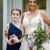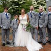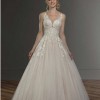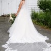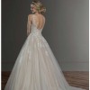 The gown’s high, illusion neckline has an organic lace finish, and is complemented with a sweetheart neckline. The rich lace of the bodice extends slightly onto the full ballgown skirt, which is the perfect complement to the shimmer of the skirt. A slight V-back of the gown is accentuated on either side with illusion-lace straps, and a shimmery, finished train completes the look. The back of this princess ballgown with floral lace zips up beneath pearl buttons.