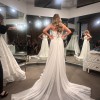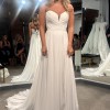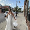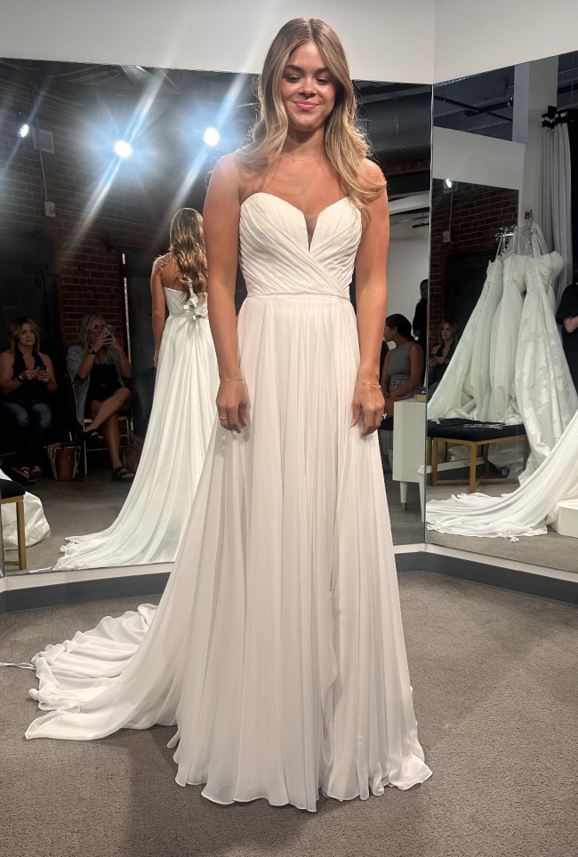 a romantic A-line wedding dress draped in soft layers of delicate chiffon. The notched plunging neckline accentuates the soft pleating of the romantic wrapped bodice. Detachable off-the-shoulder blouson sleeves add a luxe detail for this versatile wedding look, which can also be worn strapless. The clean and simple aesthetic is made complete with a soft A-line skirt that floats and sways with every movement, with a side slit detail and head-turning train.