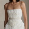 Pleated satin, bubbled and collapsed soft crinoline ball gown. Horse hair for skirt shaping and hand tacking across waist and under bust for shaping. Soft internal corset with boning and grosgrain accent belt with three position closure. Center back heavy duty zipper closure.