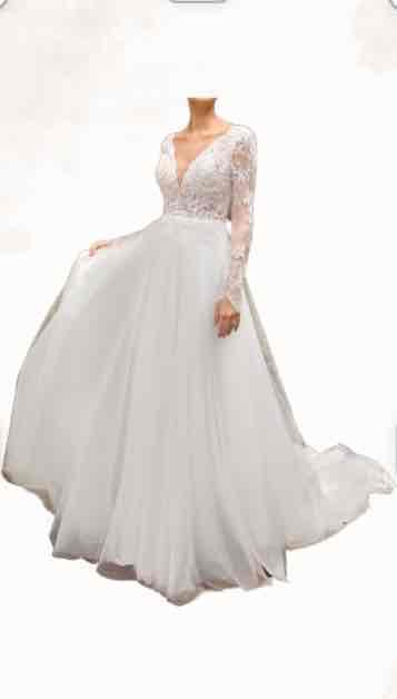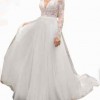 This A-line bridal gown defines romance. Delicate Chantilly lace is mixed with sequined appliqués to create the V-neckline and long sleeves. The back reveals an alluring low keyhole and leads into the soft tulle skirt. Appliqués gently float down the back of the skirt to frame the hem of the gown for the perfect finishing touch.