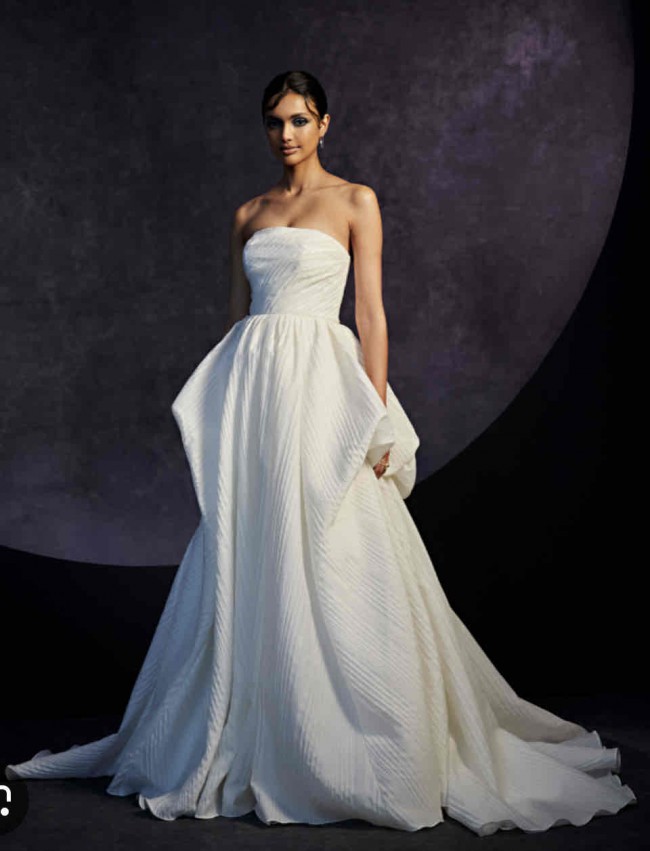 Gently Used Sample From our Bridal Boutique: From the Designer: Theia Aurora is a stunning textured organza strapless ballgown. Material: Organza | Neckline: Straight Across | Silhouette: Ballgown | Sleeves: Strapless