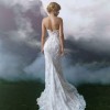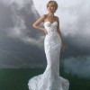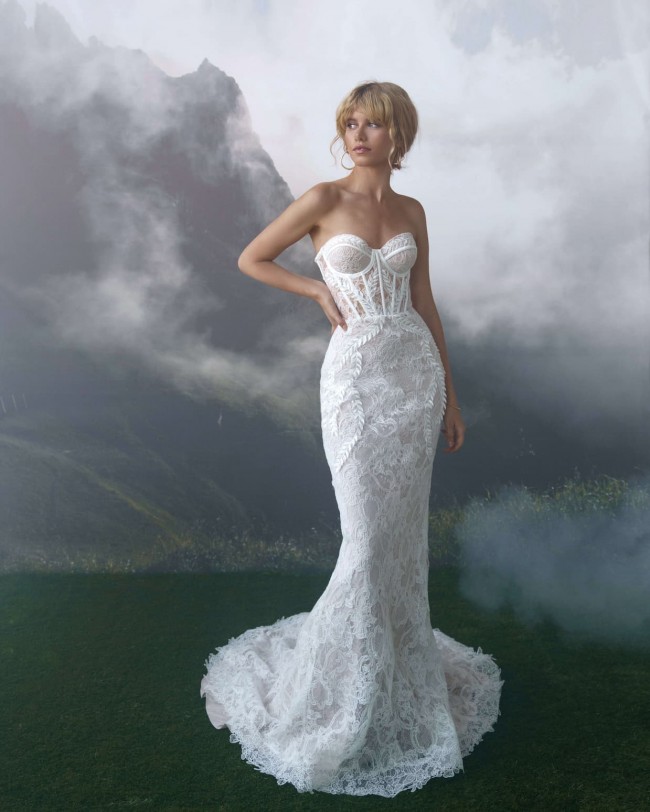 The sweetheart neckline accentuates the décolletage, while intricate lace detailing covers the entire gown, adding texture and depth. The lace patterns are delicately placed over a semi-sheer fabric, creating a romantic and ethereal effect. The dress flows seamlessly into a soft, lace-edged train, enhancing its graceful, feminine appeal. The design balances classic elegance with a bold, contemporary aesthetic.