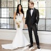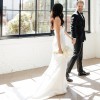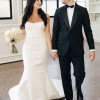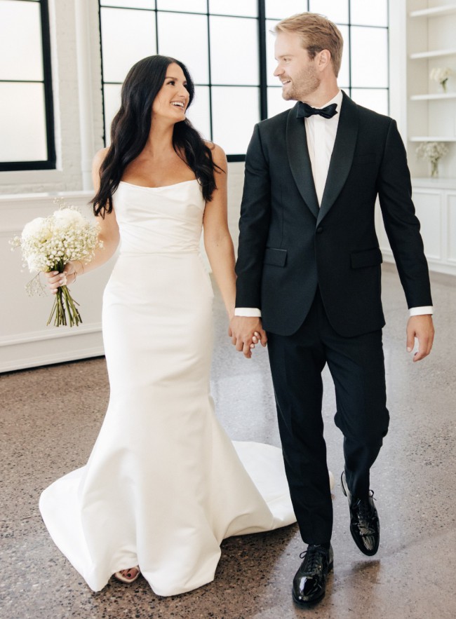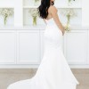 Strapless ruched bodice, fit-to-flare gown in duchess satin. 1 button fell off, but I have two extra's.