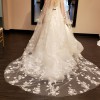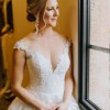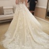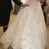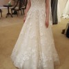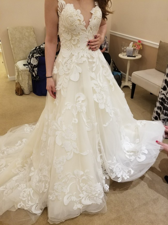 This gorgeous dress has been tried on only once. It is clean and virbant with large applique flowers, buttons that run the entire back length of the dress, with a long train. It comes with a cathedral length veil. It is a size 4 with no alterations!