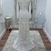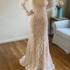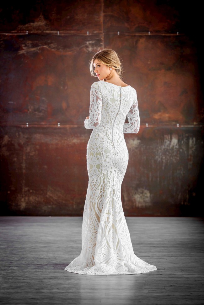 If you're looking for the perfect second bridal look, something you can dance in with flair, this gown is for you. Fully sequined in a one-of-a-kind pattern with stretch jersey lining. With it's semi-chapel length train this would make the perfect formal gown too! *Fit model is a street size 6/8 with measurements of 35