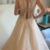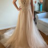 Exquisite beaded accents on embroidered lace are the highlight of the bodice on this sleeveless A-Line gown with shimmer tulle and a horsehair border along the hemline. The color is ivory/light champagne with nude illusion. *Gown was clipped to fit the model.*