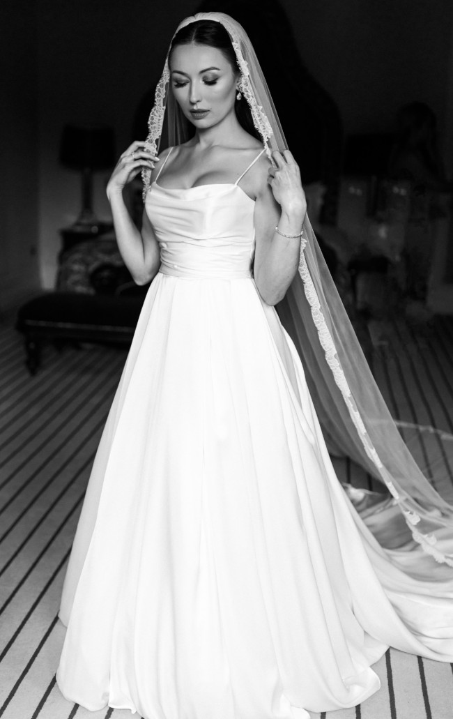 “Scarlet” style. Perfect condition dry cleaned. I am usually size 8 top. Beautiful dress that I got so many compliments on, and chose because it is timeless yet modern and could be paired with a detailed veil. Has concealed pockets also. I’m usually a size 8-10 but this dress is size 6 - it was tight on my waist on the day so it makes sense. Having said that, the fitted a line waist was a feature which also added to the look of the dress! I’m 5”8 for reference. Fell in love with this dress when I saw it and ordered it there and then - it was the first dress I tried on! Made me feel so good and was exactly what I wanted for a chic, timeless look with simple but effective silhouette. I wore with a cathedral length veil. Has net skirting underneath. Bridal shop suggested I wore a hoop underneath to keep off my legs but I preferred it without. Has loop inside skirt to hold skirt up when dancing etc. I brought an evening/ reception dress to change into at night but loved this dress so much I couldn’t bare to take it off!