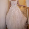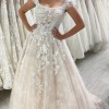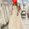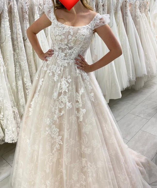 Gorgeous wedding gown. Perfect for any time of year. Colour: peach. More of an off white with a warm beige undertone as seen in photos. Corset back allows for size adjustment. Built in cups, can be removed. Never altered.