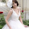 V-neck tulle wedding dress, with appliqué' asymmetrical lace detail.