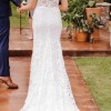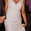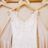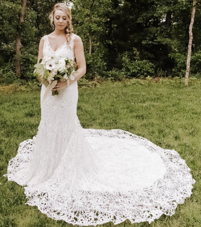 This is a beautiful and very high quality dress. Bought in 2018 for a 2019 wedding at Kleinfeld’s in NYC, I have never owned something so luxurious in my life! It is easy to put on and wear - it has one simple back zipper with hook and eye closure at the top and I didn’t need any additional sort of bra whatsoever, a huge plus in my opinion. This has a good build in support structure with push up cups and I loved not having to worry about that. I am a tall girl (5’10 in the shoes I wore) and this is a long dress, with a long train that fans out so well for photos. The material is thick and heavy. I had no trouble walking, dancing or moving around though, and wore it throughout the reception as well. My favorite part is the neckline, it shows off the collarbones so nicely and I love that it is a wider cut v-shape, both in the front and the back. That part is also just beautiful where the lace goes up onto the mesh and you can really see the lacy details. So gorgeous! This is label size 12 but it fits more like a 10. I did have alterations done to take in the waist area slightly, shorten the shoulder straps and to add bustle hooks to hold up the gown for the reception. There were three bustle attachments, and that is the one area I wasn’t thrilled with (which was no fault of the dress itself, just the alterations done!). Due to the heavy material, the hooks attached were just not heavy duty enough to hold it up super securely. One came undone and I had to have my mom fix it back up mid reception, but it definitely was not on there correctly after that, then the hook came off completely. This did rip through one of the very delicate lines of lace but it really is not noticeable with how busy the dress is. I would highly recommend removing the remaining two hooks and getting a better bustle situation sewn in or just leaving them off if you don’t want it bustled! I also think the very bottom hemline looks a little bit raggedy, it’s supposed to be uneven lace but parts could be trimmed up to lay a bit nicer again after being worn. The dress is not dirty, but it was not professionally cleaned after wearing. I would recommend a dry cleaning.