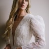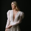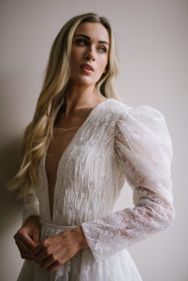 Botanical inspired embroidery, arranged in a hand pleated bodice accentuated by oversized statement sleeves and contrasted by a plunging neckline. A feature open back is completed by a crepe belt, which singes in the A line silhouette at the waist.