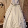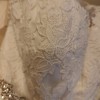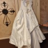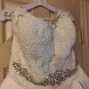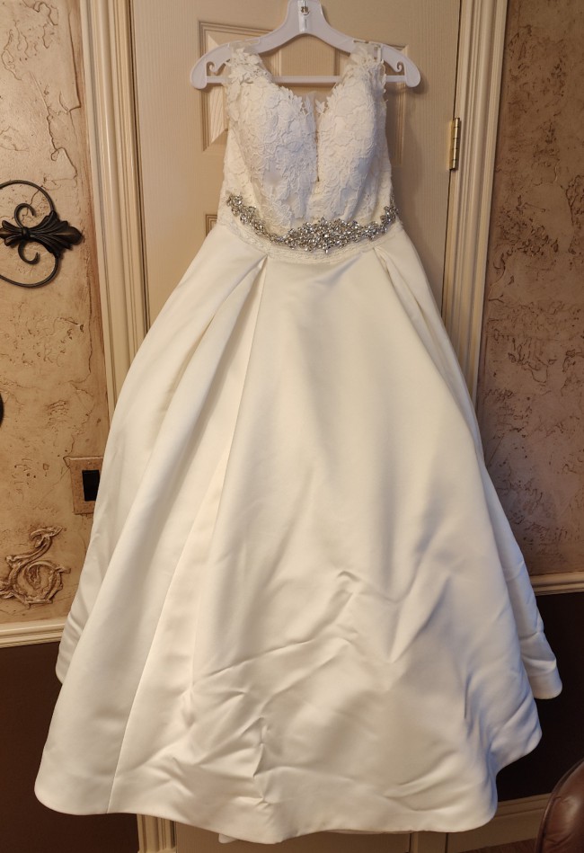 They had to let the dress out so the back is kinda ribbon and can fit up to a size 18. This dress WILL NEED to be CLEANED. This is a little dirty from my wedding. It's 2 years old and very well taken care of. This dress has no flaws other than needs to be cleaned.
