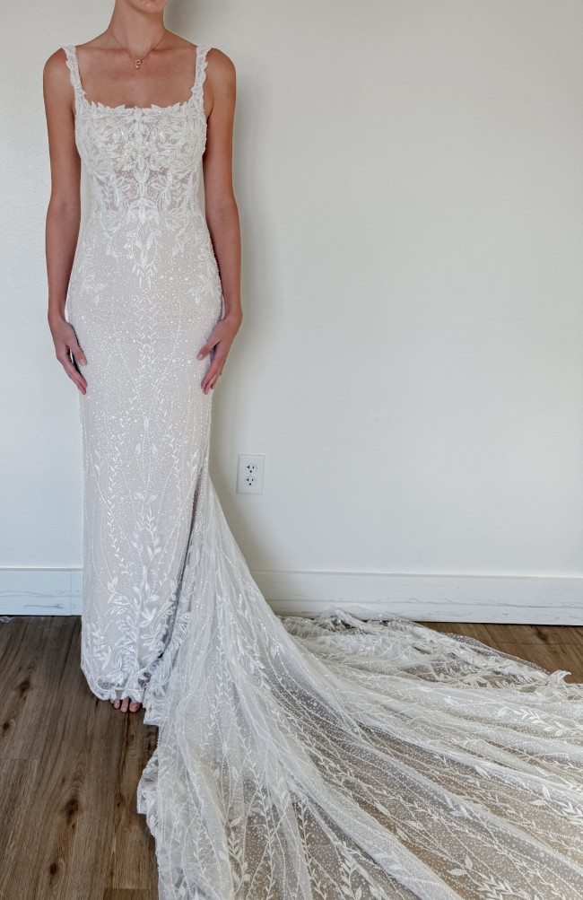 This gowns colorway is Ivory/Blush/Champagne. Custom gown from Watters. Square neck, full corset bodice, sheer bodice, full gown with sparkle tulle. Please message me for additional photos or with any questions you have!
